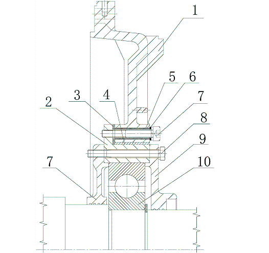 本技術(shù)涉及變頻電機,特別涉及一種YVP變頻電機軸承防電腐蝕結(jié)構(gòu),該結(jié)構(gòu)適用于大功率的變頻電機。 背景技術(shù): 本實用公開了一種大功率變頻電機絕緣軸承套,其通過在軸承的周圍設(shè)置絕緣材料來阻隔電流。但是,該技術(shù)仍然存在以下幾點不足: (1)內(nèi)外軸承蓋以及軸承座均 需重新設(shè)計,與變頻電機的原系列產(chǎn)品不能通用,產(chǎn)品升級需要的投 入較大; (2)絕緣材料需要通過膠粘的方式和在金屬件上加工鴿尾槽 的方式與金屬件結(jié)合,制作十分不便,不利于控制成本。 技術(shù)實現(xiàn)要素: 本技術(shù)的目的在于,提供一種變頻電機軸承防電腐蝕結(jié)構(gòu)。本設(shè)計不僅實現(xiàn)了阻止零序電流經(jīng)過軸承的目的,且具有實施成本低的優(yōu) 勢,有利于在產(chǎn)業(yè)上推廣應(yīng)用。 與現(xiàn)有技術(shù)相比,本技術(shù)的變頻電機軸承防電腐蝕結(jié)構(gòu)能有效阻 止零序電流經(jīng)過軸承,避免軸承被電腐蝕,保證變頻電機正常運行,從而提高了變頻電機的可靠性,試驗表明,本技術(shù)的變頻電機軸承防 電腐蝕結(jié)構(gòu)應(yīng)用到功率為37kW~1600kW的中大型變頻電機時,電 機軸承不存在電腐蝕現(xiàn)象;此外,與現(xiàn)有技術(shù)相比,本技術(shù)的變頻電 機軸承防電腐蝕結(jié)構(gòu)還具有以下幾點優(yōu)勢:(1)本技術(shù)中的前、后軸 承蓋的結(jié)構(gòu)和尺寸可以與原系列保持相同,具有變頻電機的零件通用 性,不需要重新設(shè)計,使得產(chǎn)品升級的投入較低;(2)本技術(shù)中,絕 緣材料不需要通過膠粘的方式與金屬件結(jié)合,也不需要通過在金屬零 件上另外加工鴿尾槽與金屬件結(jié)合,結(jié)構(gòu)簡單,制作方便,有利于控 制成本。 作為優(yōu)化,前述的變頻電機軸承防電腐蝕結(jié)構(gòu)中,所述環(huán)體部位 于所述套體部的內(nèi)側(cè)端部。環(huán)體部位于所述套體部的內(nèi)側(cè)端部時,軸 承套易于制造,有利于控制成本。 作為優(yōu)化,前述的變頻電機軸承防電腐蝕結(jié)構(gòu)中,所述第一絕緣 管的一端與所述絕緣板接觸,另一端與所述套體部的外側(cè)端面齊平。 該結(jié)構(gòu)特征可以防止電機端蓋和軸承套因緊固件松動而發(fā)生直接接 觸的情況,進一步提高了絕緣性能,從而使變頻電機的正常運行得到 了進一步保證。 作為優(yōu)化,前述的變頻電機軸承防電腐蝕結(jié)構(gòu)中,所述第二絕緣 管的一端與所述絕緣板接觸,另一端與絕緣墊圈接觸。該結(jié)構(gòu)特征可 以防止電機端蓋和第二緊固螺栓因松動發(fā)生直接接觸,同樣起到進一 步提高了絕緣性能的作用,從而使變頻電機的正常運行得到了更進一 步保證。 為控制成本,作為優(yōu)化,前變頻電機軸承防電腐蝕結(jié)構(gòu)中,所述 的絕緣板、第一絕緣管、第二絕緣管以及絕緣墊圈均為環(huán)氧布材料制 品。進一步,所述絕緣板的厚度為2.5~3.5mm;所述第一絕緣管的 管壁厚度為2.5~3.5mm;所述第二絕緣管的管壁厚度為1.5~ 2.5mm;所述絕緣墊圈的厚度為1.5~2.5mm;試驗表明,絕緣部件 采用上述厚度時,絕緣性能具有保障,成本也較低。更進一步,作為 產(chǎn)業(yè)化生產(chǎn)的一個具體方案,所述絕緣板的厚度為3mm;所述第一 絕緣管的管壁厚度為3mm;所述第二絕緣管的管壁厚度為2mm;所 述絕緣墊圈的厚度為2mm 附圖說明 具體實施方式 下面結(jié)合附圖和具體實施方式(實施例)對本技術(shù)作進一步的說明,但并不作為對本技術(shù)限制的依據(jù)。 參見圖1和圖2,本技術(shù)的變頻電機軸承防電腐蝕結(jié)構(gòu)包括套設(shè) 在軸承10外圈上的軸承套2,軸承套2由軸向的套體部21和徑向的 環(huán)體部22(環(huán)體部22即圖2中圓圈內(nèi)的部分)構(gòu)成;所述軸承套2 的套體部21與分別設(shè)置在所述軸承10兩側(cè)的軸承內(nèi)端蓋11和軸承 外端蓋9通過第一緊固螺栓8聯(lián)接;所述軸承套2的環(huán)體部22與電 機端蓋1通過第二緊固螺栓7聯(lián)接;所述套體部21與所述電機端蓋 1之間設(shè)有第一絕緣管4;所述環(huán)體部22與所述電機端蓋1之間設(shè)有 絕緣板3;所述第二緊固螺栓7的螺桿和所述電機端蓋1之間設(shè)有第 二絕緣管5;所述第二緊固螺栓7的頭部和所述電機端蓋1之間還設(shè) 有絕緣墊圈6。 本技術(shù)中,沿軸承套2徑向設(shè)置的絕緣板3和沿軸承套2軸向設(shè) 置的絕緣管4以及第二絕緣管5和絕緣墊圈6起到阻止電流從電機端 蓋1流向軸承套2的作用,從而避免軸承10因零序電流經(jīng)過對地形 成環(huán)流出現(xiàn)電腐蝕的現(xiàn)象。 綜合考慮絕緣性能和制作成本,所述絕緣板3、第一絕緣管4、 第二絕緣管5以及絕緣墊圈6可以采用環(huán)氧布材料制品(可以直接從 市場訂購)。所述絕緣板3的厚度可以為2.5~3.5mm;所述第一絕緣 管4的管壁厚度可以為2.5~3.5mm;所述第二絕緣管5的管壁厚度 為可以1.5~2.5mm;所述絕緣墊圈6的厚度可以為1.5~2.5mm。 技術(shù)特征: 包括套設(shè)在軸承(10)外圈上的軸承套(2),軸承套(2)由軸向的套體部(21)和徑向的環(huán)體部(22)構(gòu)成;所述軸承套(2)的套體部(21)與分別設(shè)置在所述軸承(10)兩側(cè)的軸承內(nèi)端蓋(11)和軸承外端蓋(9)通過第一緊固螺栓(8)聯(lián)接;所述軸承套(2)的環(huán)體部(22)與電機端蓋(1)通過第二緊固螺栓(7)聯(lián)接; 所
